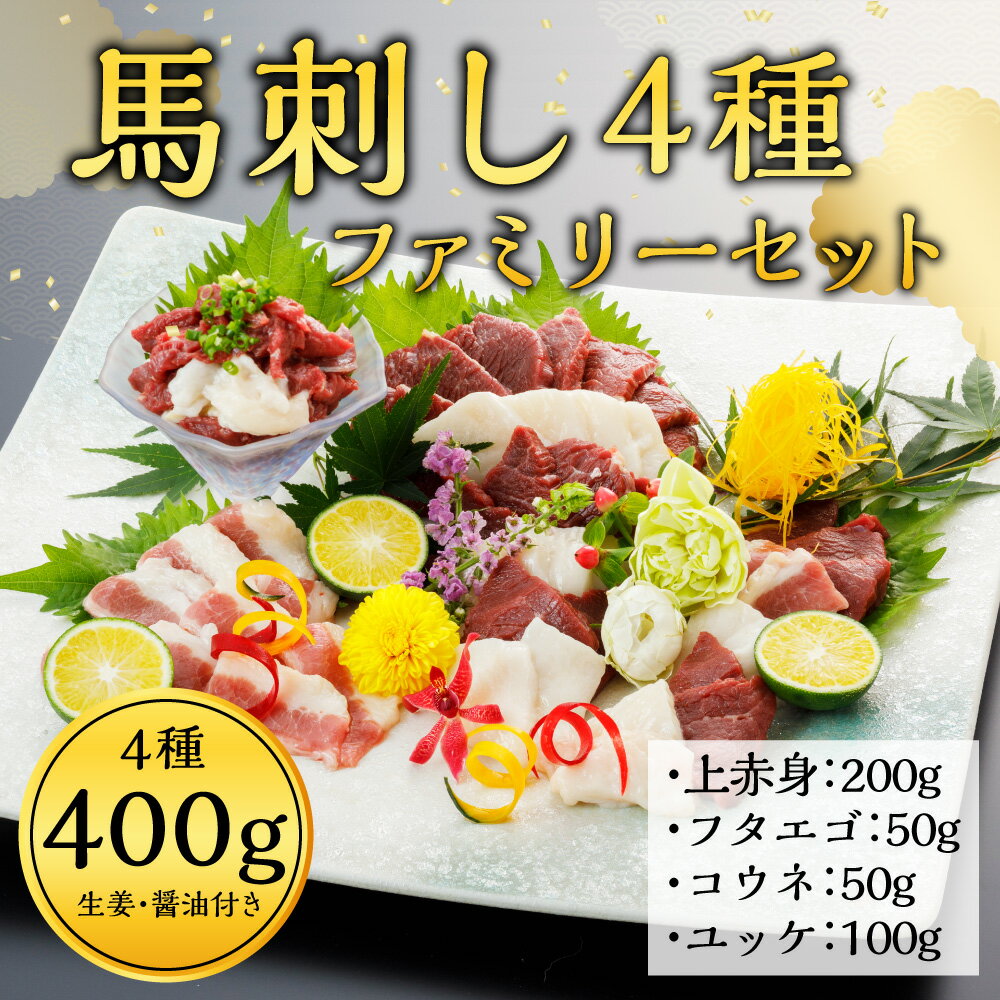 【ふるさと納税】馬刺しの4種ファミリーセット400g 肉の屋 馬肉 肉 上赤身 フタエゴ コウネ ユッケ 惣菜 おつまみ タレ付き 熊本肥育 冷凍 送料無料